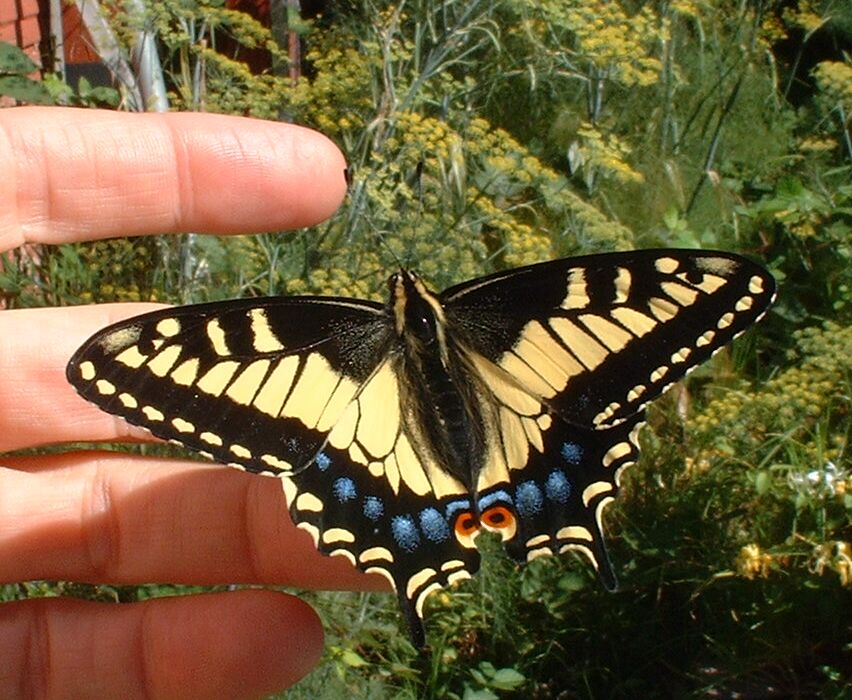 Release: About 2 hours after emerging from the pupa, our guy started getting frisky, so I put my index finger in front of him and gently nudged his front legs. He obligingly climbed aboard, and we walked out the back door...where he immediately launched himself and flew to the nearest fennel plant...and landed a little less than gracefully. More of a "thunk" than a delicate alighting; it takes them a while to get the hang of it.