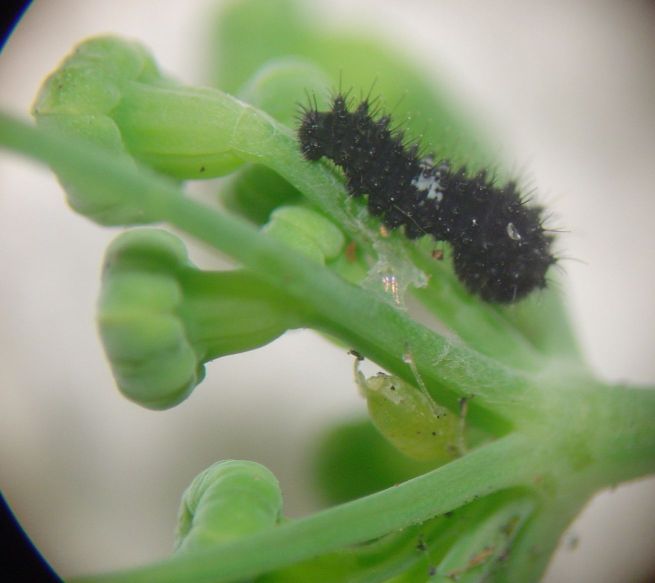 Some baby caterpillars eat every last bit of the eggshell, while others leave some behind. The one below didn't finish its eggshell (the nibbled white transparent material just to its right). Note the green aphid lurking behind the next flower stem, and that the caterpillar has what appears to be a bit of eggshell tangled in its hairs.
