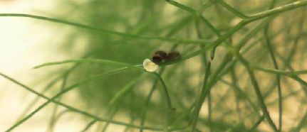 Once the caterpillar has finished its meal of eggshell, there is a radical change in its diet---to fennel fronds or whatever other part of the fennel plant on which the caterpillar happens to have been born. In the above case, the butterfly laid the egg on a developing flowering head, so the developing flowers and their stems will become food.