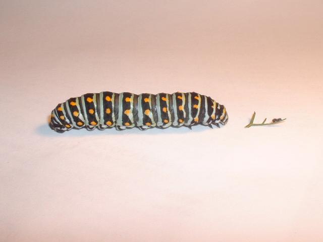Below is the baby caterpillar romping around after finishing its meal of eggshell. Like youngsters of other species, he (or she) is either moving around actively or pausing to seemingly rest. The back-and-forth head motions are usually an indication that silk is being deposited on the stems of the fennel plant, but in this case, there is no visible silk. Caterpillars lay down a lot of silk, presumably to help themselves keep a grip on the stem.