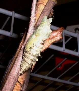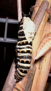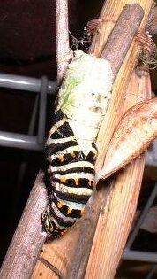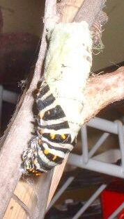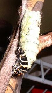 I remember the first time I saw a swallowtail pupa...it was startling, and strangely disturbing. There is an alien quality about the shape, and perhaps resonance with memories of pictures of mummies or quadruple amputeeism. Also perhaps a hint of claustrophobia--it's easy to imagine being locked inside, utterly helpless and vulnerable.